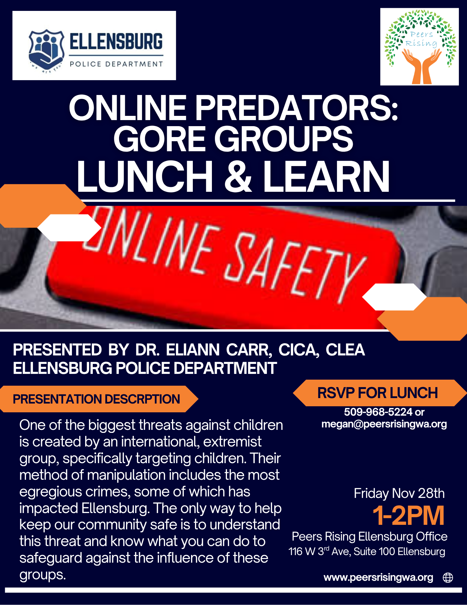Online Predator Lunch and Learn Friday, November 21, 2025 1:00 PM 2:00 PM Peers Rising 116 W 3rd Ave, Suite 100 Ellensburg United States (map) Google Calendar ICS