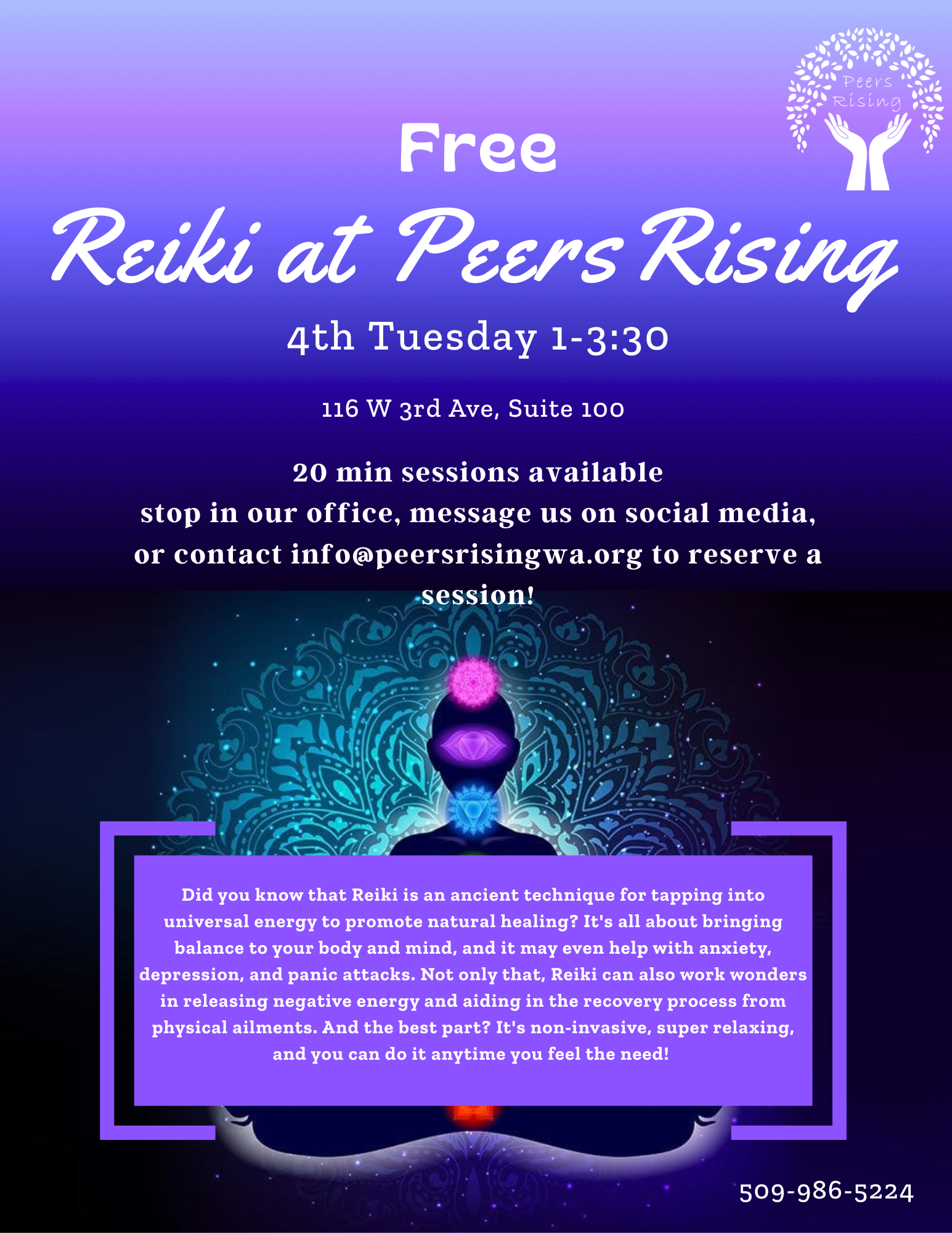 Reiki Tuesday, February 24, 2026 12:00 PM 1:00 PM Peers Rising 116 W 3rd Ave Ellensburg, WA, 98926 United States (map) Google Calendar ICS
